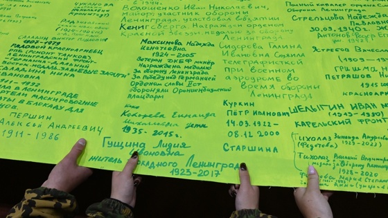 Весь прошлый год участники акции, посвященной 80-летию со дня освобождения Ленинграда от блокады, наносили на ленту Победы имена жителей и защитников города. Их на полотнище более 5 тысяч.