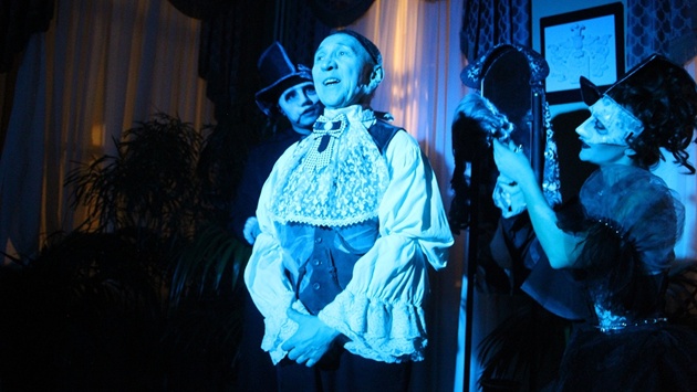 Спектакль ведет зрителей по коридорам и залам усадьбы, как по лабиринту. Везде тайные знаки: здесь брошены перчатки, там мерцают огоньки свечей, тут - нитка бус или бокал. Свет приглушен, сюжеты знакомы: "Каменный гость", "Пир во время чумы", "Моцарт и Сальери"... Но среди известных героев присутствует еще один. И он не рассказчик, не наблюдатель. Он - действующее лицо. Это сам Пушкин. В поле "Маленьких трагедий" режиссер бродилки вводит и их автора, ищет в них параллели с судьбой гения - от мятежной юности до последнего пира.