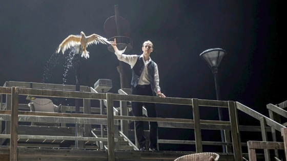 Декорации спектакля напоминают лодочную станцию - деревянный помост, камыши, даже вода, по которой шлепают герои. Время от времени над действием с криками взлетают тени чаек. Чуть впереди - такая же деревянная сцена и лавочка перед ней. Здесь Нина Заречная (Софья Шидловская) и будет читать свой знаменитый монолог. В спектакле она договаривает каждую фразу до последней капельки дыхания в груди и сдавленного голоса, а новую начинает с шумного вдоха - так, что зрители этой мистерии вздрагивают.