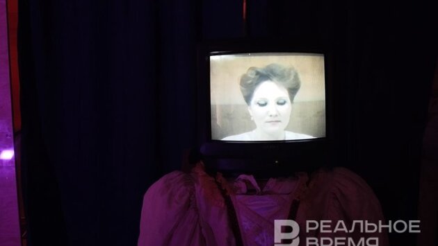 На сцене представили инсталляцию "Видео-Аве Мария": на фигуру в платье водружен телевизор, с которого высокое искусство доносит прима оперного театра Зиля Сунгатуллина.