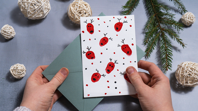 Если вы хотите привлечь детей к созданию новогодних открыток, идея с отпечатками станет альтернативным выбором. Это не только весело, но и мило, особенно если открытки собираются дарить бабушкам и дедушкам.