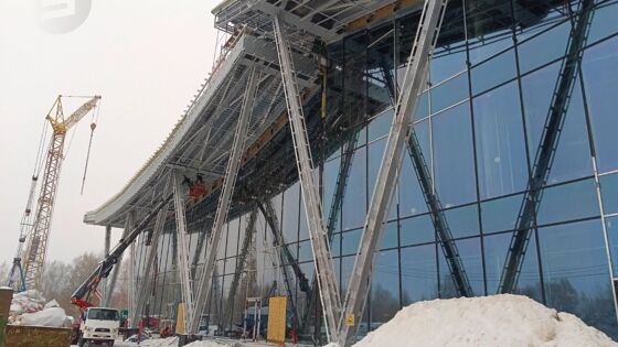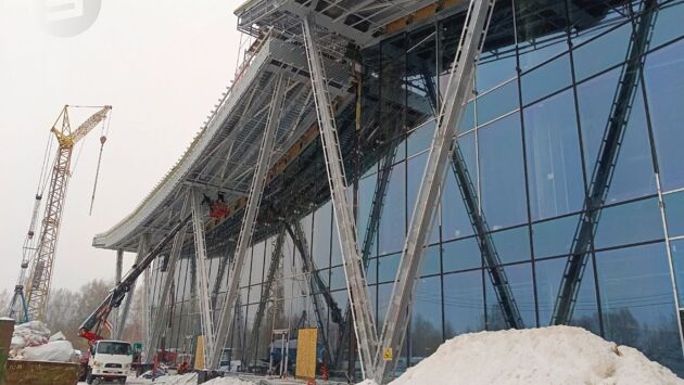 В настоящий момент на объекте ежедневно трудятся около 120 человек. Снаружи уже почти уложили всю кровлю, а также практически на 90% завершено остекление фасада. К терминалу подводят инженерные сети.
