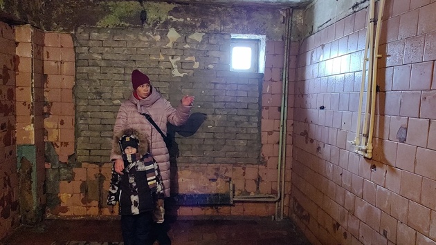 Собственно, жильцы про себя так и говорят: "Живем на болоте". Подвал затоплен грунтовыми водами. Из крана в душевой на первом этаже тонкой струйкой течет вода. Странно, что она не замерзает, ведь температура в помещении не выше уличной, потому что отопления в здании нет. На вопрос, как же здесь моются дети, Светлана вздыхает: "Включаем горячую воду, закрываем дверь и ждем, пока воздух прогреется. А потом быстро-быстро купаем ребятишек. Но они все равно простывают, пока бегут из душа домой по ледяному коридору..."