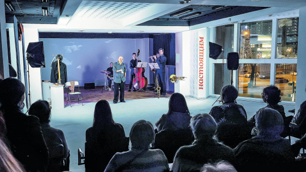 Во "Флейте-позвоночнике" объединились художественное слово и джаз. Текст читал, точнее, играл героя поэмы, артист "СамАрта" Алексей Елхимов. За музыку отвечал джаз-квартет, собранный гитаристом Дмитрием Дмитриевым. В состав ансамбля также вошли Илья Галант (контрабас), Екатерина Ананьева (барабаны) и Иван Нестеров (флейта, саксофон и валторна). Получился небольшой спектакль в жанре саунд-драмы на стыке театра, литературы и музыки.
