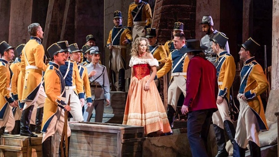Арии и дуэты главных героев часто проходят внутри или на фоне массы поющих персонажей, развиваясь параллельно и вторгаясь друг в друга. Все это создает интригу и динамику раскручивающейся пружины. Это невероятно сложно как сыграть, так и поставить.