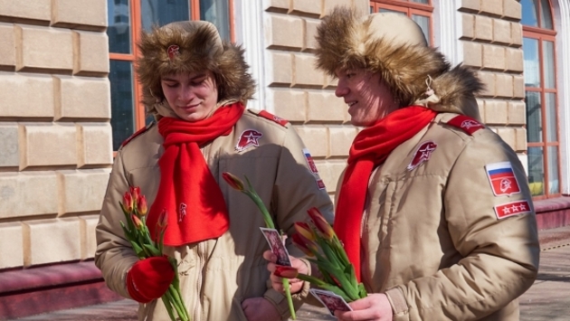 Юные патриоты Хабаровска поздравили женщин с 8 Марта: раздавали тюльпаны на улице