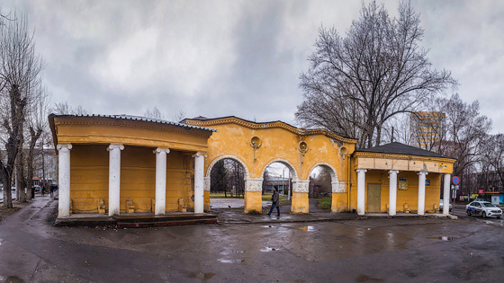 Арочные проемы, портик-галерея с ионическими колоннами, лепнина в виде венков, колосьев, серпов, молотов и пятиконечных звезд со светильниками в виде факелов – роскошный остановочный павильон был построен во время Великой Отечественной войны для работников завода расточных станков.
