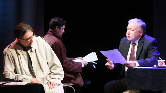 "Пьеса для чтения" и на бумаге выглядит как рассказ, без разбивки на реплики. И в "Гласе" сочли логичным выбрать для представления этого сценического рассказа жанр спектакля-читки, когда актеры просто читают текст в лицах, а зритель получает возможность рисовать действие в своей голове.