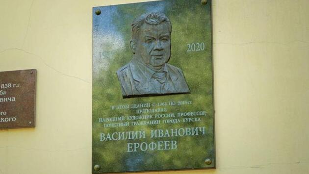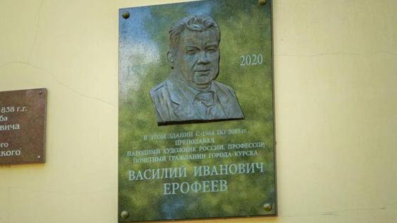 Доска появилась на здании художественно-графического факультета КГУ Инициаторами этого события стали комитет культуры и туризма города Курска, Курское региональное отделение Союза художников России и КГУ. Автором барельефа является скульптор, заслуженный художник РФ Николай Криволапов. На работу ушло около трех лет, Криволапов выполнил проект безвозмездно. Василий Ерофеев был народным художником России, членом Союза художников СССР и России, а также международной ассоциации изобразительных искусств АИАП Юнеско. Он был лауреатом премии губернатора Курской области имени А. А. Дейнеки и победителем конкурса «Человек года». Ему было присвоено звание «Почетный работник высшего профессионального образования», а в прошлом году - «Почетный гражданин Курска». Работы Ерофеева находится в государственных картинных галереях, художественных музеях и частных коллекциях в России и за рубежом.