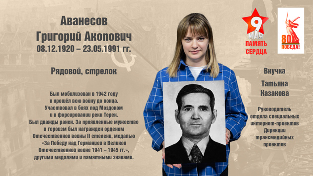 «Вряд ли в нашей стране найдется семья, которую обошла стороной Великая Отечественная война. И моя семья не исключение: оба моих деда стали ее участниками. Григорий Акопович Аванесов, отец моей мамы, служил рядовым, стрелком. На передовую его забрали после службы в армии. Он был призван в 1942 году и прошел всеми фронтовыми дорогами до Победного мая. За проявленную в боях особую храбрость, стойкость и мужество был награжден орденом Отечественной войны II степени и медалью «За Победу над Германией в Великой Отечественной войне, — рассказывает внучка Татьяна Казакова.