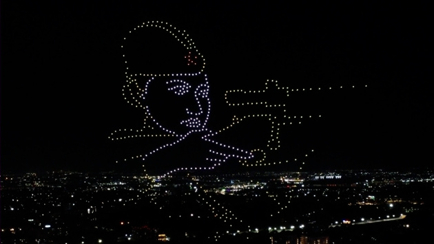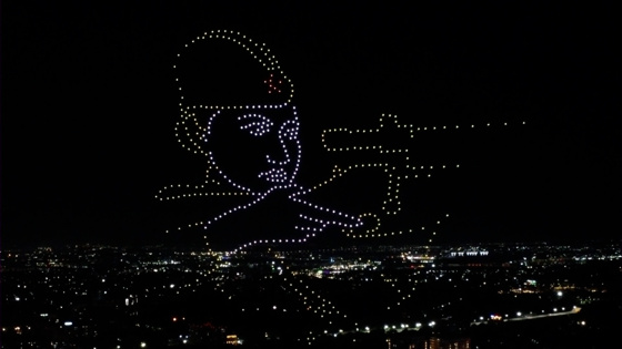 А затем по вечернему небу пролетели светящиеся журавли — как символ памяти. Завершился небесный концерт поздравлением с юбилеем победы.
