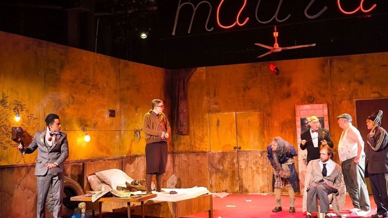 А вот у командировочных-алкоголиков Анчугина (Грязнов) и Угарова (Юлия Шек) из того же номера дни спустя во втором действии другая проблема: надо опохмелиться, а денег нет. Их приносит человек с улицы, агроном Хомутов (Дмитрий Денисов): ежели вам надо, нате, берите 100 рублей, возвращать не надо. Как это "берите"? Просто так? Просто так! Но так не бывает. Неправильный гражданин, странный, может, он украл деньги, убил кого за них? Непроспавшиеся друганы вместе с гостиничными соседями чуть ли не распинают напуганного мужичонку на стуле, пытаясь понять: он дурачок или прикидывается. Оказывается, и этот простофиля грешен, про мать забыл, а деньги - как искупление: не отдал ей, почившей, рад отдать незнакомцам.