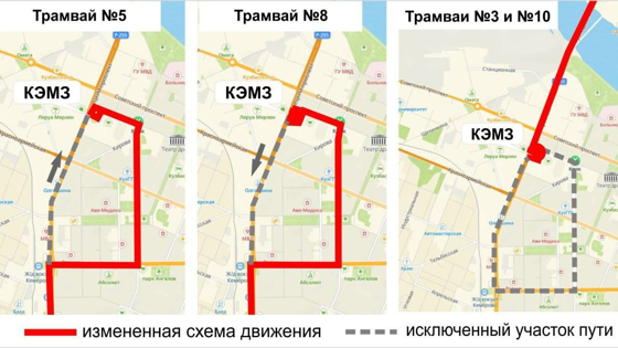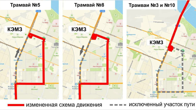 Так, маршруты трамваев №3, № 10 будут укорочены до остановки "КЭМЗ", а из привычных схем движения трамваев №5 и №8 будет исключен участок пути от железнодорожного вокзала до остановки "КЭМЗ". Маршрут №1 изменения не затронут.
