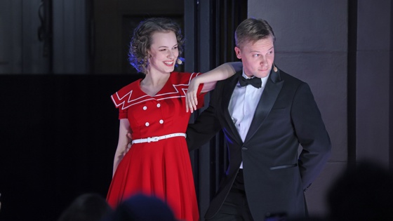 И среди зрителей, и среди вахтанговцев было много молодежи. Одними из первых на сцену вышли студенты Театрального института им. Бориса Щукина. Еще в самом начале концерта актер Александр Галочкин отметил свой день рождения зажигательной песней. А под конец вечера "молодежная" страничка приобрела постине вахтанговский размах: студенты института имени Бориса Щукина и стажеры Вахтанговской труппы внесли в концерт долю искрометного юмора. Новые актеры стажерской труппы - Даниил Бледный, Никита Шаманов, Артем Гурин, Василий Серегин - показали сценку о разнице актерского существования в школе представления и школе переживания.