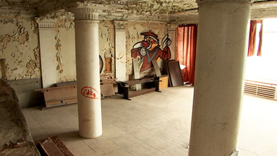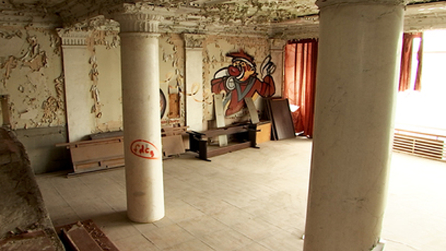 Здесь и правда всё, как в настоящем городе, застывшем на пике жизни. Просторные улицы-коридоры, на них – очертания бывших кабинетов. А вот и главная сцена – конференц-зал, где впервые читал свои стихи поэт Симонов. В этом помещении сохранилось всё, кроме рам на окнах – мраморные колонны, тумбы, даже лепнина на потолках.
