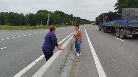 Массивный бетонный отбойник, разделяющий встречные полосы трассы Р-242, жительницы села Осыпь, что в двух часах езды от Екатеринбурга, берут на абордаж. Под сигналы большегрузов они бодро преодолевают преграду высотой примерно 70 сантиметров, не обращая внимания на мчащиеся фуры.