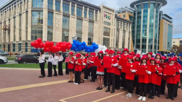 Молодые люди, облачённые в футболки цветов российского триколора, держали в руках таблички соответствующих цветов, создав из них «живую карту» родного края.
