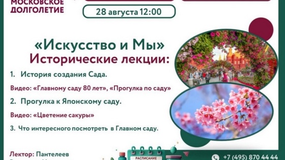 «История создания Сада» (видео «Главному саду 80 лет», «Прогулка по саду»); «Прогулка к Японскому саду» (видео «Цветение сакуры»); «Что интересного посмотреть в Главном саду». Начало в 12.00. Лектор: Владимир Иванович Пантелеев. Об этом рассказали в группе управы района Савелки в социальной сети vk.