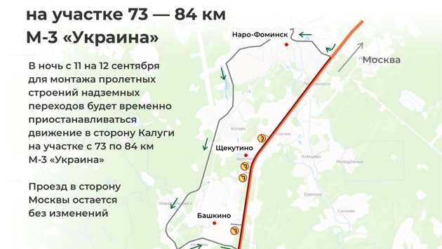В ночь на 12 сентября на трассе М3 «Украина» в Наро-Фоминском городском округе будут монтировать пролеты надземного пешеходного перехода. В связи движение по участку с 73-го по 84-й километр в сторону Калуги перекроют с 23.00 до 5.00. Автомобили все это время будут отправлять в объезд – через Московскую и Заводскую улицы Наро-Фоминска, Новую Ольховку и Каурцево. В сторону Москвы проезд будет открыт, сообщает ГК «Автодор».