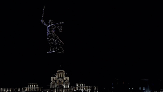 Одним из ярких моментов шоу стало изображение Родины-матери — официального логотипа 80-летия Победы.