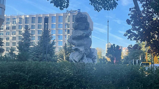 Около скульптуры все еще стоит строительная техника.