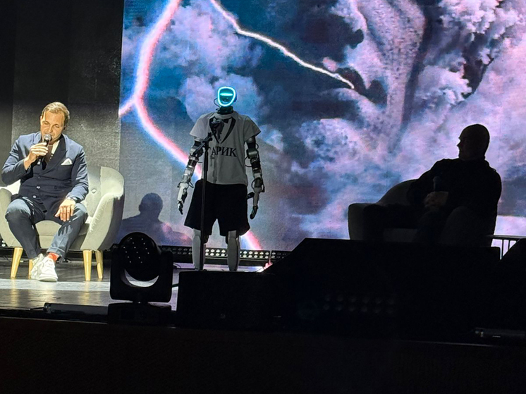 Ровно через пять минут, в которые был исполнен эффектный по хореографии фрагмент, символизирующий союз классики, современности и новаций, на сцене появились творческие, но продвинутые в цифровой реальности мужи — режиссер и актер театра, кино Алексей Свиридов, продюсер, режиссер 3D-шоу Юрий Ярушников и… робот. Робота звали Гариком, и одет он был как футболист: черные до колен трикотажные трусы, серая майка с рукавами до локтя. Гарик стоял между сидящими в креслах спикерами и после них отвечал на вопросы модератора дискуссии Олега Голуба.