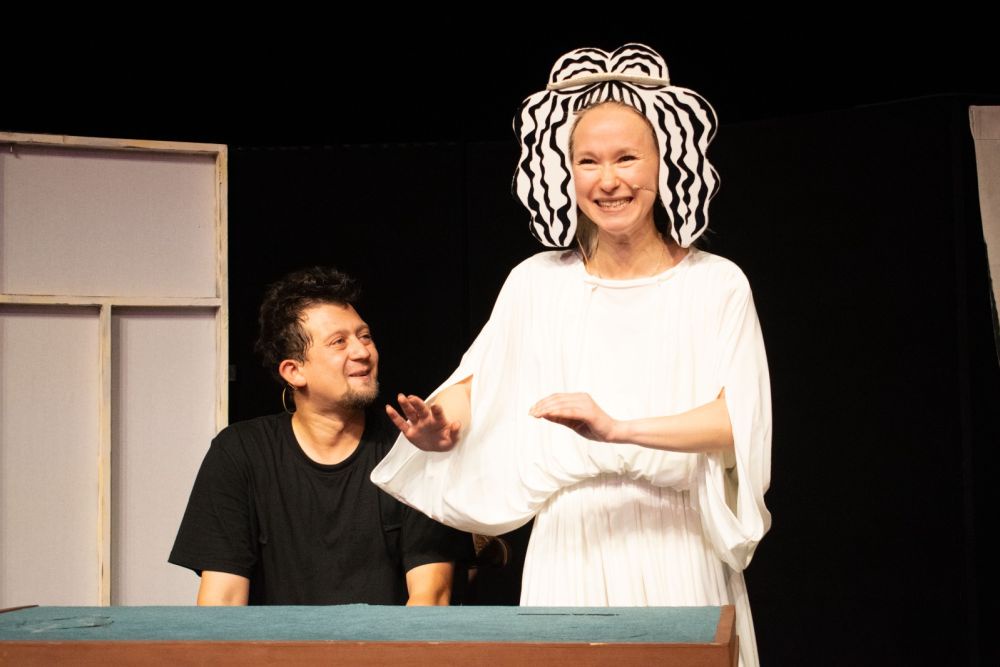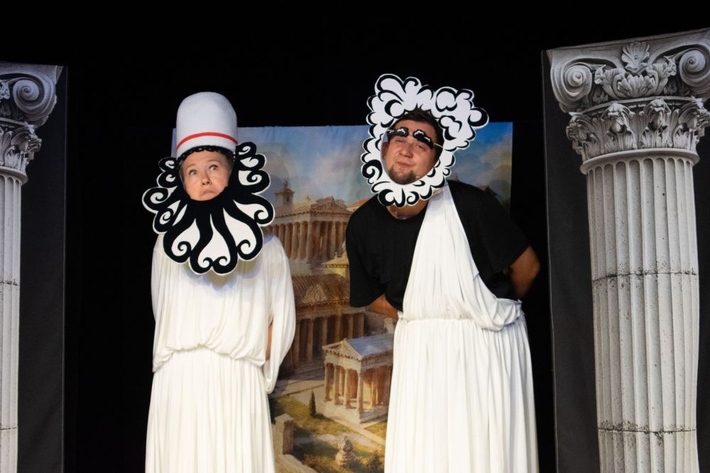 Спектакль планируют сделать выездным, и для этой цели художник Аниса Туманшина создала декорации, которые легко перевозить. Ширма сдвигается и раздвигается, а нужную картину помогают создать повествовательные и световые декорации, обозначающие место действия - Древнюю Грецию, зал библиотеки, картину за окном. Костюмы тоже трансформируются легко, ведь актеров всего двое, а действие должно быть непрерывным.