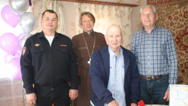 На днях представители полиции совместно с членом Общественного совета при МУ МВД России «Сызранское» настоятелем храма в честь великомученика Георгия Победоносца протоиереем Александром Устиновым и подполковником милиции в отставке Александром Васильевичем Матвеевым пришли домой к ветерану органов внутренних дел Виктору Степановичу Скосыреву. Они выразили ему благодарность за многолетний и образцовый труд в рядах советской милиции и поздравили с днём рождения. Виктор Степанович встретил гостей в праздничном настроении, полный сил и энергии, в окружении жены Галины Степановны и дочери Зои Викторовны. Честь поздравить ветерана со столь значительной датой от имени руководства сызранской полиции выпала начальнику специального приёмника МУ МВД России «Сызранское» капитану полиции Андрею Шикину. Так совпало, что Андрей Александрович, как и Виктор Степанович, отмечает свой день рождения в один день с юбиляром. Кроме того, юбиляр более 25 лет прослужил в подразделении, которым сейчас руководит капитан полиции. Узнав об этом, 90-летний именинник быстро произвел подсчёты и сообщил присутствующим, что, когда он в далёком 1982 году уходил на заслуженный отдых, Андрей Александрович даже ещё не родился! В ходе непринуждённой беседы ветеран поделился с гостями секретами своего долголетия, главный из которых – любовь и поддержка близких. Со своей супругой Галиной Степановной он живёт душа в душу уже более 60 лет. Она в курсе всего, что интересно мужу. Вместе они вспомнили имена сослуживцев Виктора Степановича и рассказали занятные истории, связанные со службой. К поздравлениям присоединился Александр Устинов. Он пожелал юбиляру здоровья, бодрости духа, семейного благополучия и вручил ему памятные подарки от Общественного совета при территориальном органе. Председатель ветеранской организации Александр Васильевич заверил юбиляра и его семью, что они всегда могут рассчитывать на поддержку, необходимую помощь, заботу и внимание со стороны руководства МУ МВД России «Сызранское». Принимая поздравления, Виктор Степанович поблагодарил гостей за добрые слова и участие.