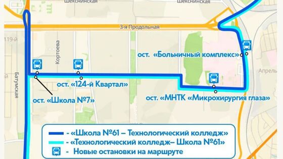По ходу своего движения транспортные средства будут останавливаться возле здания "124-го квартала" и новой школы №7, дополнительно обслуживая район расположения отделения "Микрохирургия глаза" и Больничного комплекса.