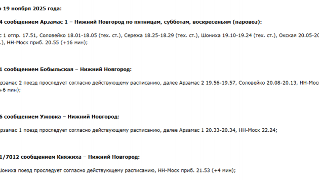 До 19 ноября по обновленному расписанию будут курсировать электрички из Арзамаса, Вада, Ужовки и Княжихи до Нижнего Новгорода.