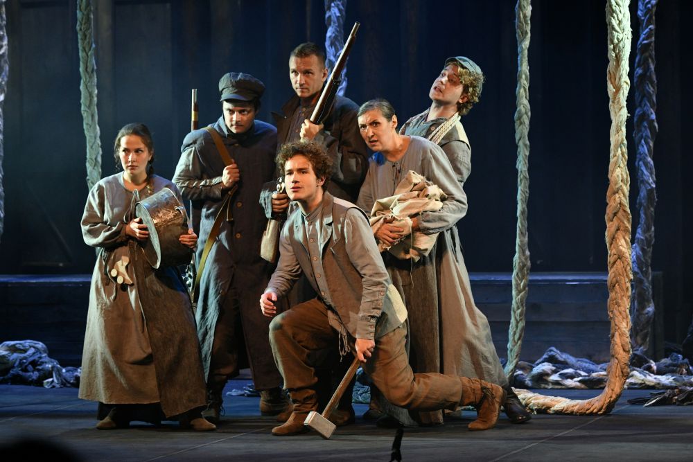 Кстати, о музыке. В "Лютом" она звучит не в записи, а вживую. Ее исполняют артисты, не зря же на авансцене стоят гитара и думбыра, а барабаном служит гулкая коробка. Завершается спектакль на высокой ноте: артисты исполняют песню Лютого, вызывая слезы у публики.