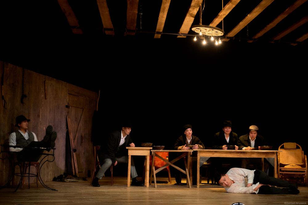 Поначалу действие развивается неспешно. На сцене - обстановка "салуна", хозяин которого в ковбойских сапогах ждет посетителей. Они врываются с мороза, отряхиваются, толкаются, застывают в вопросительных позах, глядя на своего "главного". И все это молча. И только когда поданную в мисках еду гости начинают судорожно хлебать, опустив в них лица, становится понятно, что перед нами стая волков. И это не Дикий Запад, а казахская степь.