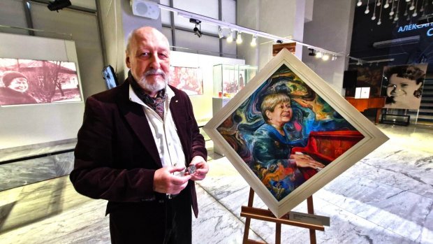 – Фоном картины стал продукт одного из пяти новых направлений в изобразительном искусстве, основоположником которых я являюсь. Это палиарт, то есть искусство палитры. За 31 год работы на стекле, которое я использовал в качестве палитры, зацементировалось большое число красок. Вода испарялась, а водяные краски разных цветов оставались, микронными слоями растекались по стеклу и больше уже не смывались. Когда я стамеской отколупал скопившийся за 31 год слой засохших красок, то разглядел в отдельных его кусочках нечто похожее на минерал. И все свои картины последних лет я писал уже в технике палиарта, именно его я использовал и при создании портрета Александры Пахмутовой.