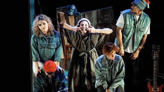 И вот спустя десятилетия на этих подмостках оказалось другая версия истории о школьной травле - "Чучело. Квартирник" Казанского ТЮЗа. Режиссер Радион Букаев (он и главреж этого театра) вместе с драматургом Анастасией Чернятьевой перенесли действие в наши дни. Дом, где жили Лена Бессольцева с дедушкой, стал музеем, и сюда ночью проникает компания старшеклассников с музыкальными инструментами, чтобы устроить квартирник. Есть в этой компании свое "пугало": так называют странную девочку, которая хвостом ходит за этими ребятами. Их застает сторож (позже мы поймем, что это постаревший Валька из повести, тот, который сдавал собак на живодерню), грозит вызвать полицию, в каком-то смысле берет ребят в заложники и... рассказывает им о своей однокласснице, которая здесь жила. Они начинают аккомпанировать этому рассказу, разыгрывают его, примерив на себя роли школьников или учителей, выходят к микрофону, поют, импровизируют. Это спектакль-концерт, и условный прием позволяет нам увидеть в компании современных ребят персонажей Железникова. Музыка, искупая огрехи инсценировки, позволяет актерам выявить эмоциональное напряжение их героев.