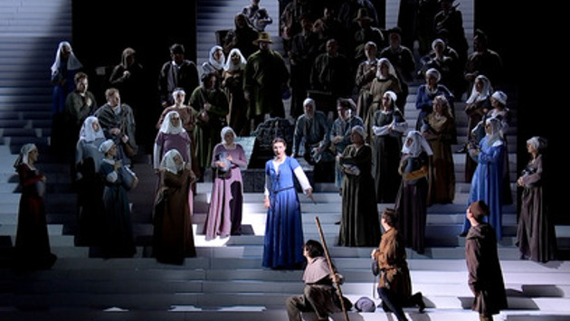 Авторы новой постановки воссоздали дух далёкой эпохи: костюмы и декорации словно сошли со средневековых миниатюр. А грандиозная лестница, которая занимает почти всю сцену, благодаря эффектным проекциям постоянно изменяет пространство.