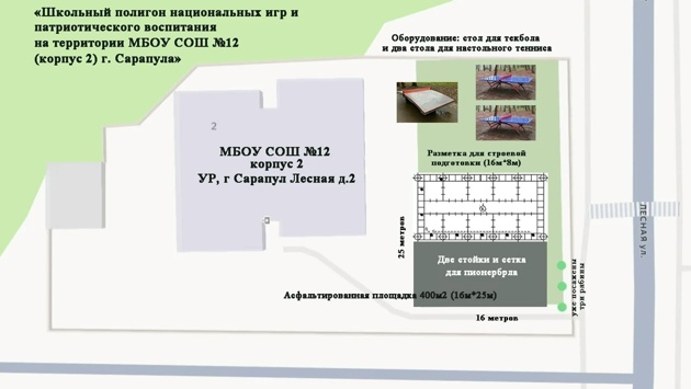 Для площадки уже выбрали место — на территории второго корпуса школы №12 на улице Лесной. В дальнейшем место планируют назвать школьным полигоном национальных игр и патриотического воспитания МБОУ СОШ №12.