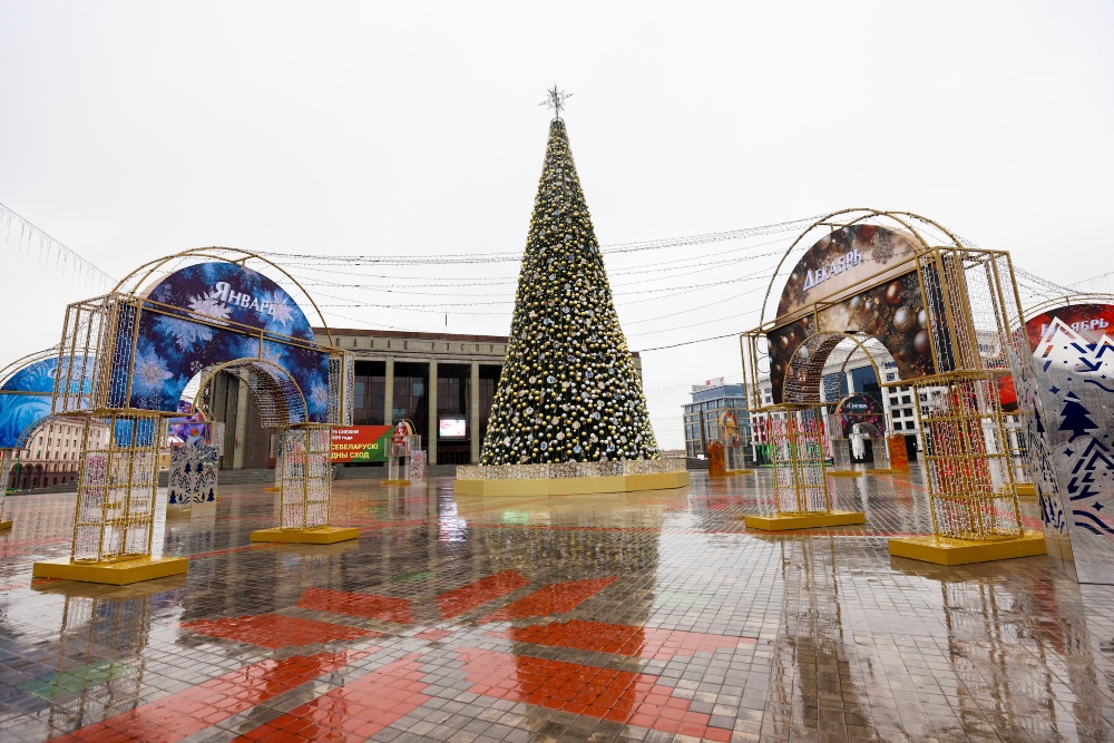 Несмотря на то что в белорусской столице погода пока совсем не зимняя, новогоднее настроение уже создано в каждом уголке города: украшены витрины магазинов и торговых центров, на центральных площадках мигают лампочками яркие инсталляции, и, конечно же, установлены елки. А главная по традиции радует минчан и гостей города на Октябрьской площади. Искусственная 30-метровая красавица, усыпанная тысячами золотых и серебряных игрушек, в этом году получила поистине королевское окружение - 12 световых арок, символизирующих месяцы уходящего года.