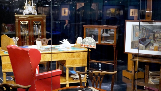 На второй этаж вас ведет "версальская" лестница, напоминающая о французском происхождении семейства: Луи Жюль Бенуа спасался бегством от Великой Французской революции и нашел пристанище в России, стал Леонтием, служил поваром-кондитером в знатных семьях, позже - при Марии Федоровне, вдове Павла I. Второй этаж весь отдан Александру Николаевичу. Здесь целый прозрачный лабиринт, в который вставлены его работы. Здесь его кабинет. Здесь в витринах - написанные Бенуа книги по искусству, предметы, рассказывающие о работе над Мольером в театре вместе со Станиславским, посмертная маска художника.