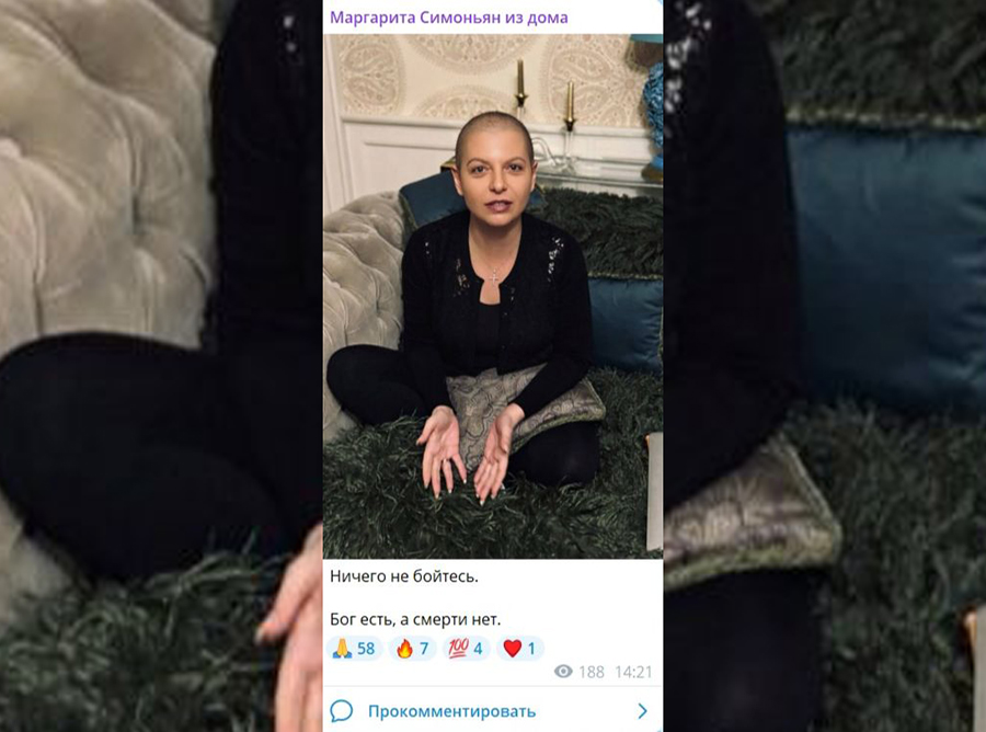 Так, в официальном телеграм-канале Симоньян опубликовала фотографию, на которой запечатлена без парика. "Ничего не бойтесь. Бог есть, а смерти нет", - обратилась к общественности журналистка.