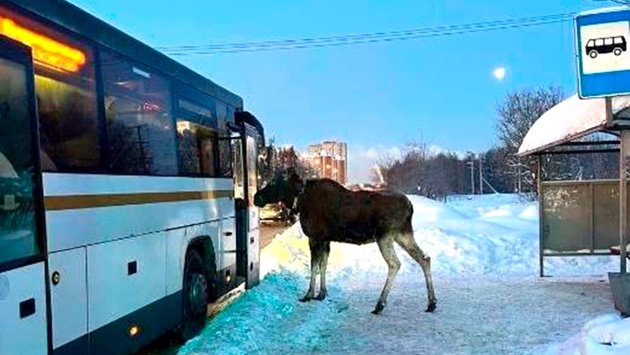 В Подмосковье заметили лося, который терпеливо дожидался чего-то на автобусной остановке, а после едва не сел в автобус - подошел прямо к раскрытым дверям.
