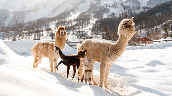 Несмотря на то, что от прихотей снежной зимы альпак надежно защищает шубка, на прогулки их дополнительно утепляют флисовыми курточками. Пообщаться и погладить новое потомство гости парка смогут буквально через пару месяцев, когда им исполнится 90 дней.
