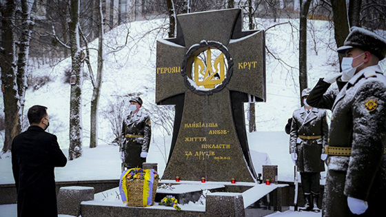 Однако в этом году президент Украины Владимир Зеленский внёс в традиционный церемониал свежую струю. «Для Украины теперь и более ста лет назад угроза одинакова. Защитники государства выполняли в бою под Крутами, по сути, ту же задачу, что и сейчас военные под Марьинкой», – заявил он во время возложения цветов к памятному кресту Героям Крут на Аскольдовой могиле в Киеве.