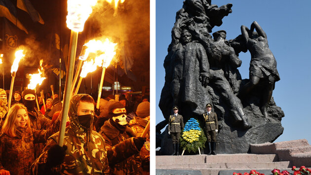 Согласно ей, "бандеровцы", "мельниковцы", "бульбовцы", дивизия СС "Галичина" и прочая нацистская нечисть - это жертвы войны, наравне с убитыми ими евреями, русскими, поляками, украинцами. Тогда как Советский Союз - виновник как войны, так и Холокоста. Об этом вещают сегодня центральные украинские СМИ. И в момент, когда президент Зеленский встречал израильского коллегу Ицхака Герцога, министр культуры страны Александр Ткаченко публично возложил на СССР вину за Бабий Яр на очередной презентации к дате. В другой день и на другом мероприятии, можно не сомневаться, он возложит на евреев вину за голод 30-х годов - теперь это тоже почти официальная историческая доктрина.