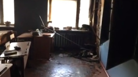 На кадрах видно обвалившуюся с потолка закоптившуюся штукатурку, разбросанную мебель и книги.