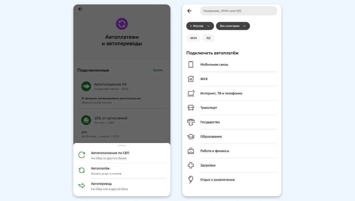 - В приложении Сбербанк Онлайн перейдите в раздел «Платежи и переводы» → «Автоплатежи» → «Создать автоплатёж».