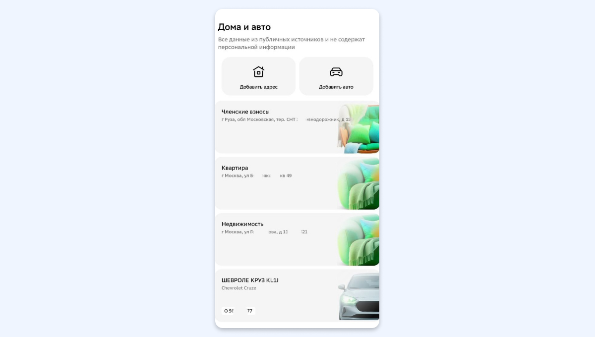 Найти сервис «Дом» или «Дома и авто» можно в разделах «Для жизни», «Платежи» или в личном профиле по кнопке в левом верхнем углу. Кликните кнопку «Добавить адрес» и введите его (можно добавить платёж по реквизитам или даже подтянуть свою недвижимость через Госуслуги). Если ваше СНТ есть в базе, выберите его из списка. Если нет — нажмите «Добавить вручную» и введите реквизиты, которые вам предоставило правление. Сохраните и назовите платёж — например, «СНТ Ромашка — членские взносы».