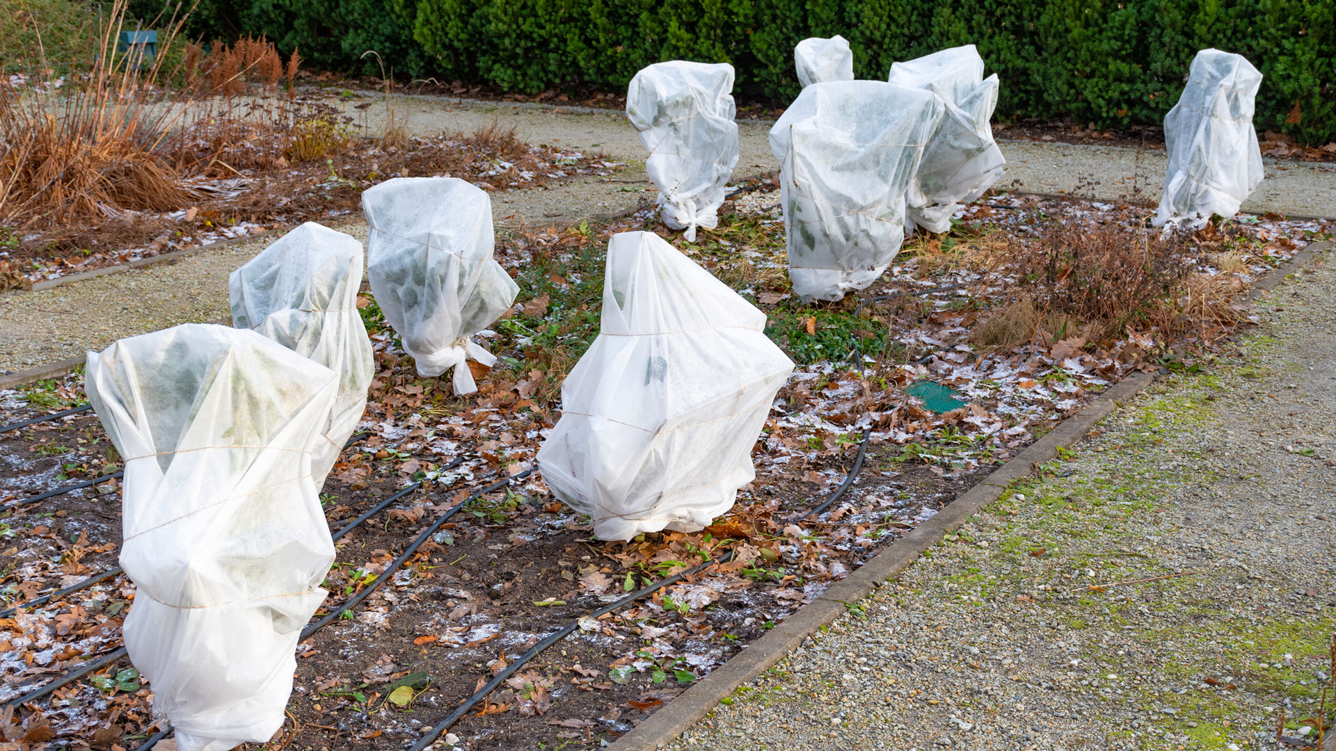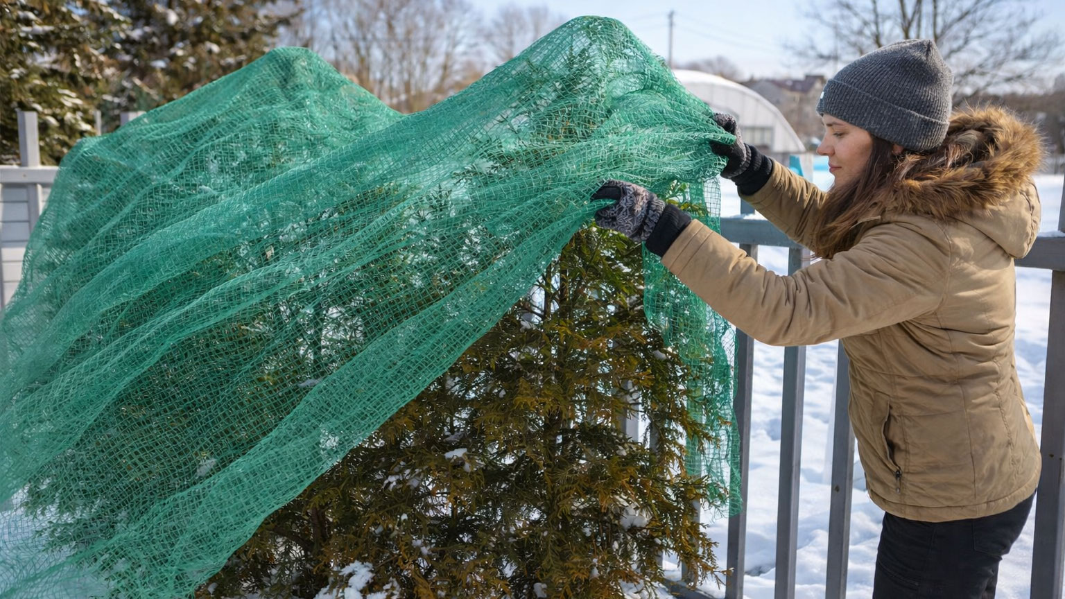 Особое внимание уделите хвойным. Весной они в зоне риска: солнце уже припекает, а корни в ещё мёрзлой земле не могут добывать влагу. Из-за этого хвоя сохнет и желтеет. Чтобы этого избежать, растения нужно притенять — например, неплотно прикрыть спанбондом или мешковиной.