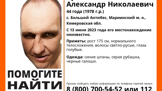 Волонтеры ПСО "ЛизаАлерт" сообщили, что в селе Большой Антибес, Мариинский муниципальный округ, пропал 44-летний Цветков Александр Николаевич. Отмечается, что местонахождение мужчины остается неизвестным с 13 июня.