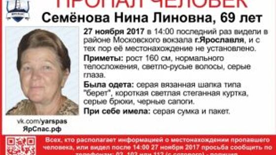 В последний раз женщину видели возле Московского вокзала в понедельник, 27 ноября, около 14 часов. С тех пор местонахождения пенсионерки неизвестно. Волонтеры организации «Ярспас» начали поиски. Приметы: рост 160 сантиметров, нормального телосложения, светло-русые волосы, серые глаза. Женщина была одета в серую вязаную шапку, короткую светлую стеганую куртку, серые брюки и черные сапоги. С собой у нее серая сумка и пакет. Если вам что-либо известно о его местонахождении, просьба сообщать по телефонам: 02, 102, 112 (с сотового) - полиция, 8 910 964 08 38 - горячая линия ЯрСпас.