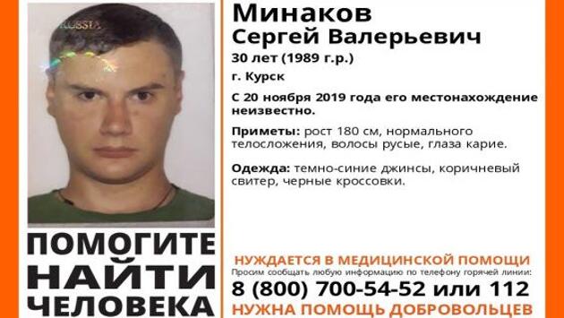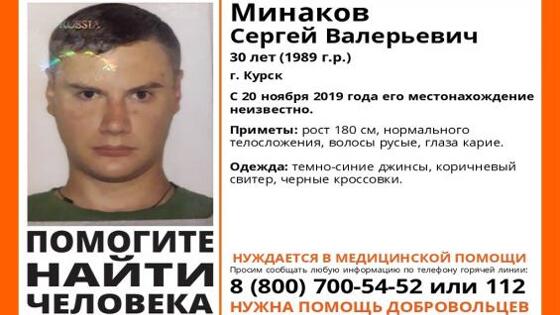 С 20 ноября 2019 года ничего не известно о местонахождении Минакова Сергея Валерьевича, 30 лет, город Курск. Приметы пропавшего: рост 180 см, нормального телосложения, волосы русые, глаза карие. Был одет в тёмно-синие джинсы, коричневый свитер, чёрные кроссовки. Нуждается в медицинской помощи! Волонтёры просят сообщать о любой известной информации по телефону горячей линии 8 (800) 700-54-52 или 112. Нужна помощь добровольцев! фото vk.com